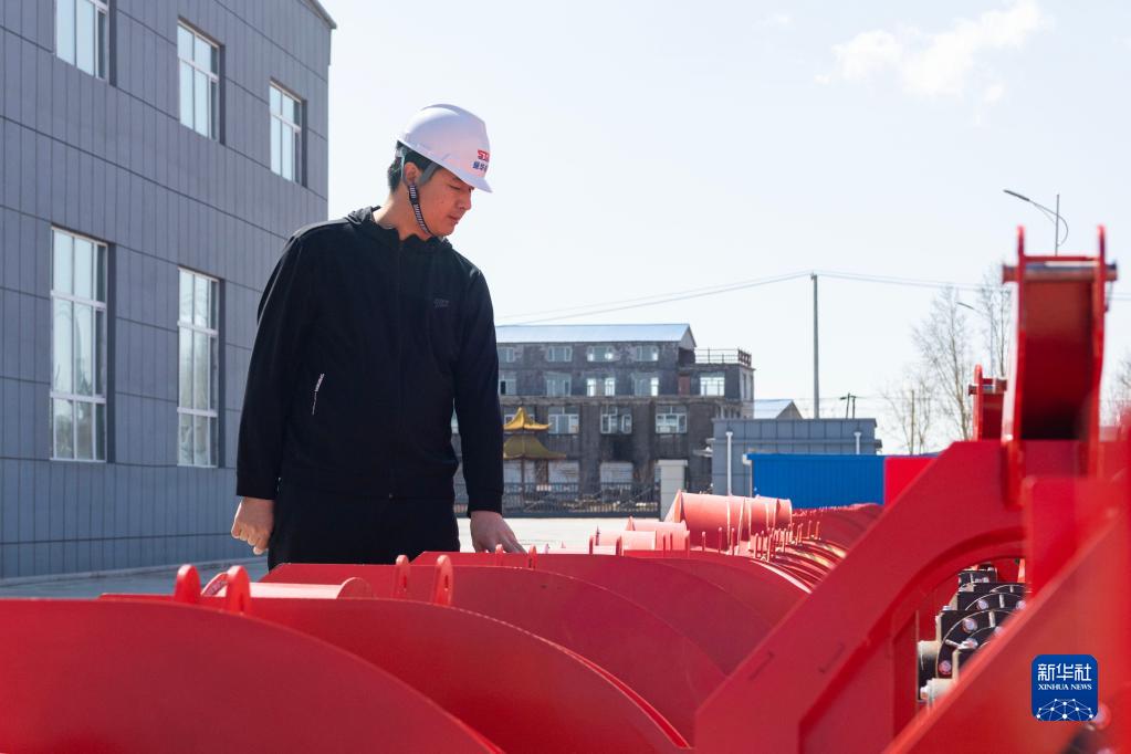 4月26日,宮照旭在公司廠(chǎng)區內查看其生產(chǎn)的水田筑埂機。