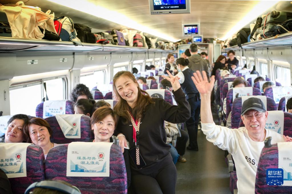 4月27日,旅客在上海假日列車(chē)“樂(lè )游長(cháng)三角·淮北號”上揮手。