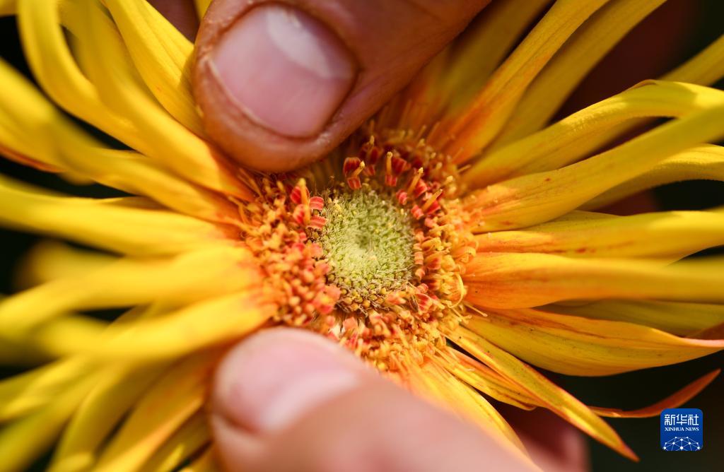 云南錦科花卉工程研究中心技術(shù)人員在查看非洲菊新品種(4月3日攝)。