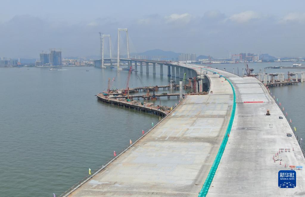 這是4月28日拍攝的深中通道橋面及遠處的中山大橋(無(wú)人機照片)。