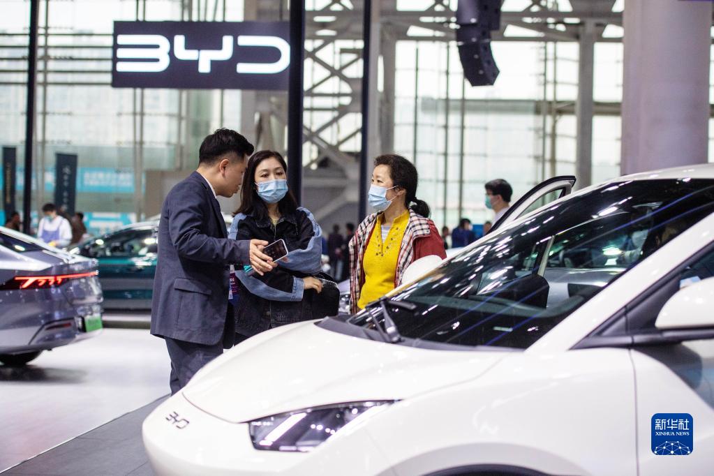 4月28日,工作人員(左)向觀(guān)眾介紹參展汽車(chē)。