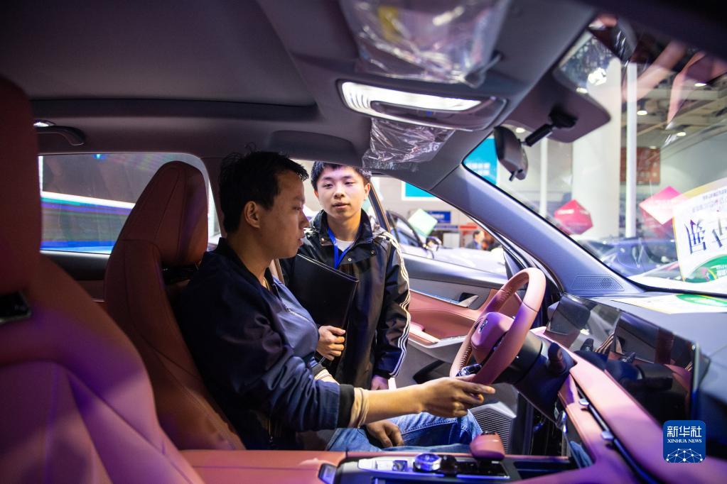 4月28日,工作人員(右)向觀(guān)眾介紹參展汽車(chē)。
