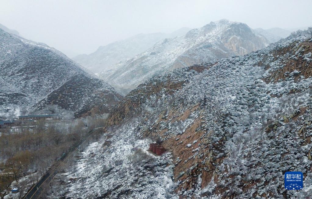 4月28日拍攝的內蒙古自治區呼和浩特市北郊的大青山自然保護區雪景(無(wú)人機照片)。