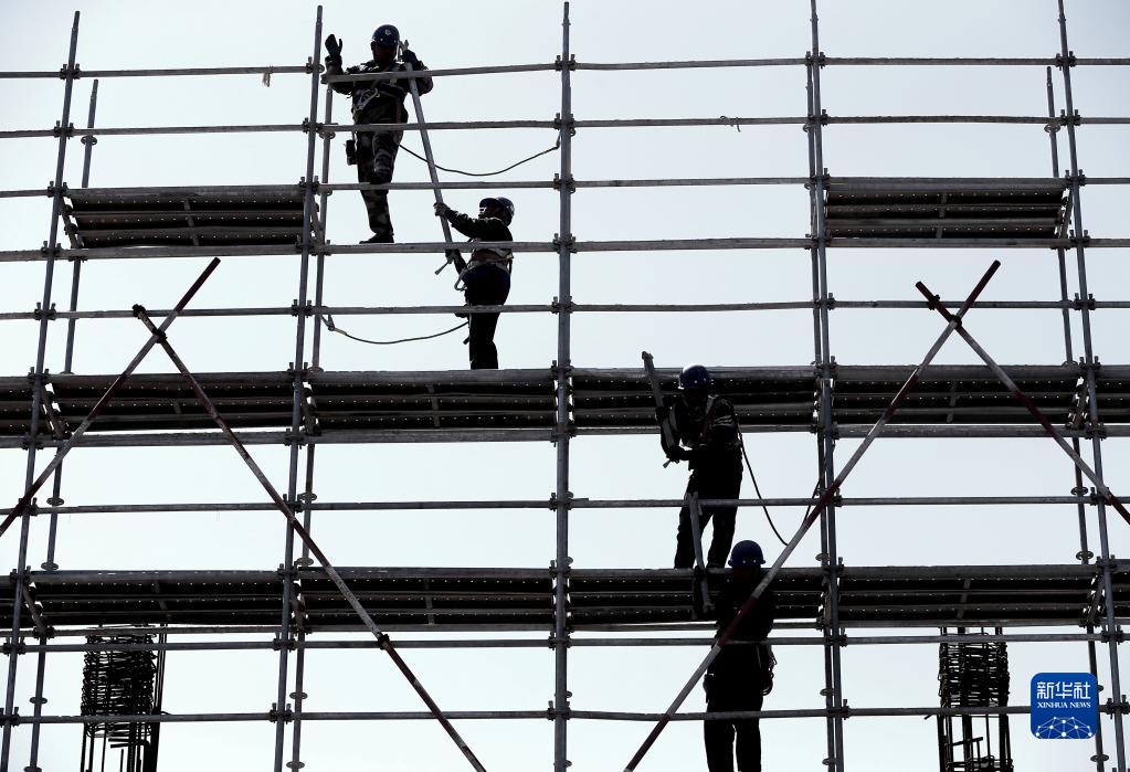 4月28日,在位于山東省青島市即墨區的中建八局四公司一處項目工地,建筑工人參加腳手架搭設項目比賽。