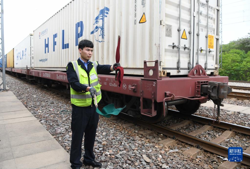 4月28日,副司機田錦波在合肥東站指揮機車(chē)與中歐班列列車(chē)對接。新華社記者 劉軍喜 攝