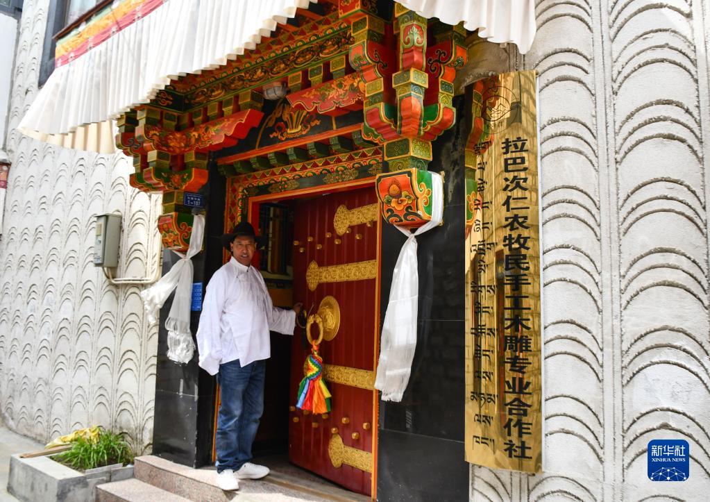 拉巴次仁在農牧民手工木雕專(zhuān)業(yè)合作社門(mén)前(4月25日攝)。