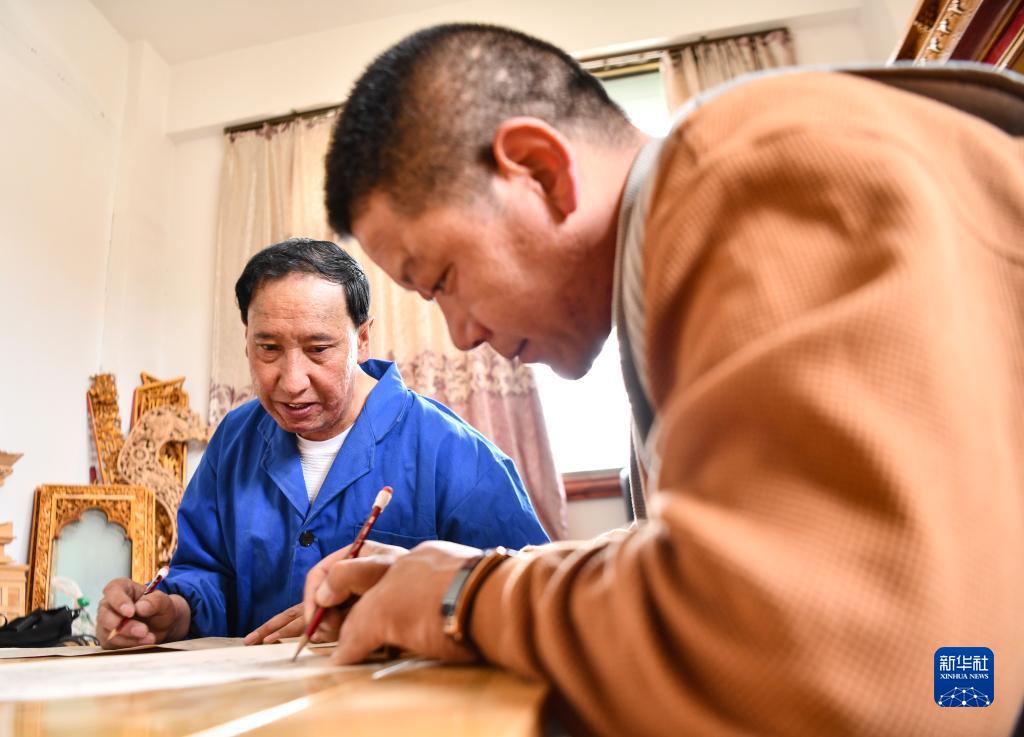 拉巴次仁(左)指導徒弟繪制木雕模板草圖(4月25日攝)。
