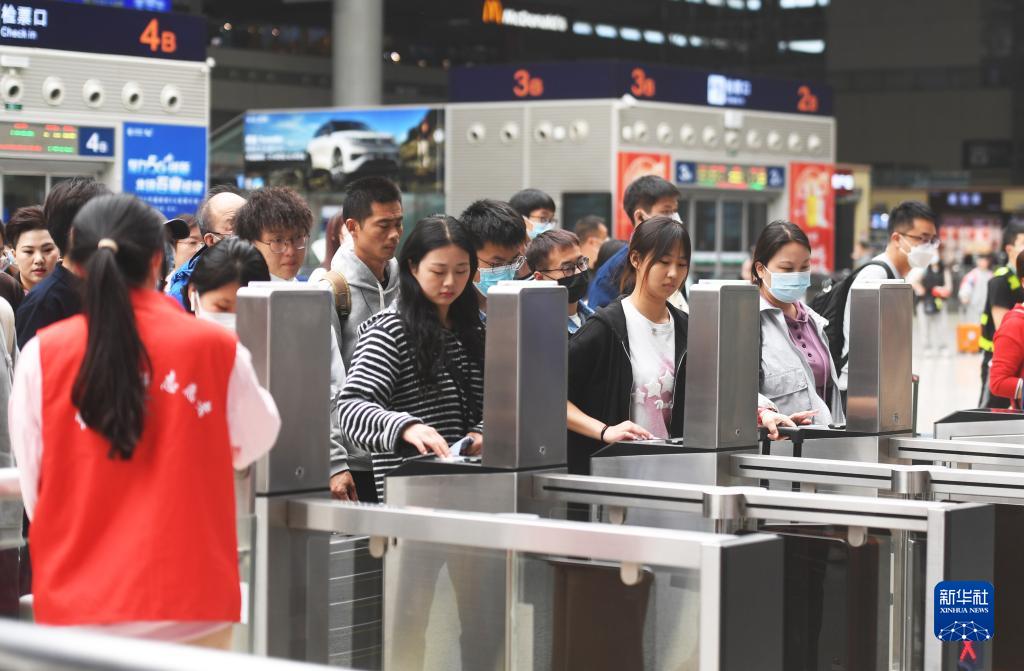 4月29日,鄭州東站志愿者引導旅客有序檢票。