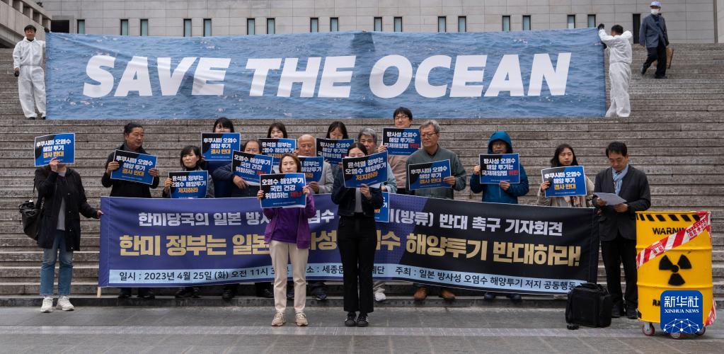 4月25日,在韓國首爾,民眾手舉標語(yǔ)抗議日本政府核污染水排海計劃。