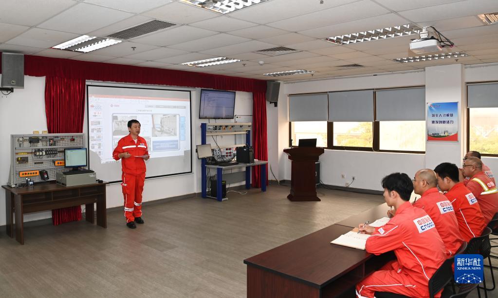 胡誠在位于海南儋州洋浦經(jīng)濟開(kāi)發(fā)區的中海海南發(fā)電有限公司為青年員工授課(4月20日攝)。
