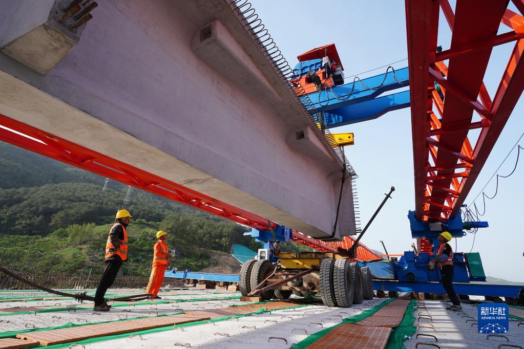 4月29日,在重慶市北碚區渝武高速公路復線(xiàn)項目施家梁立交施工現場(chǎng),中交一公局施工人員在進(jìn)行T梁架設。