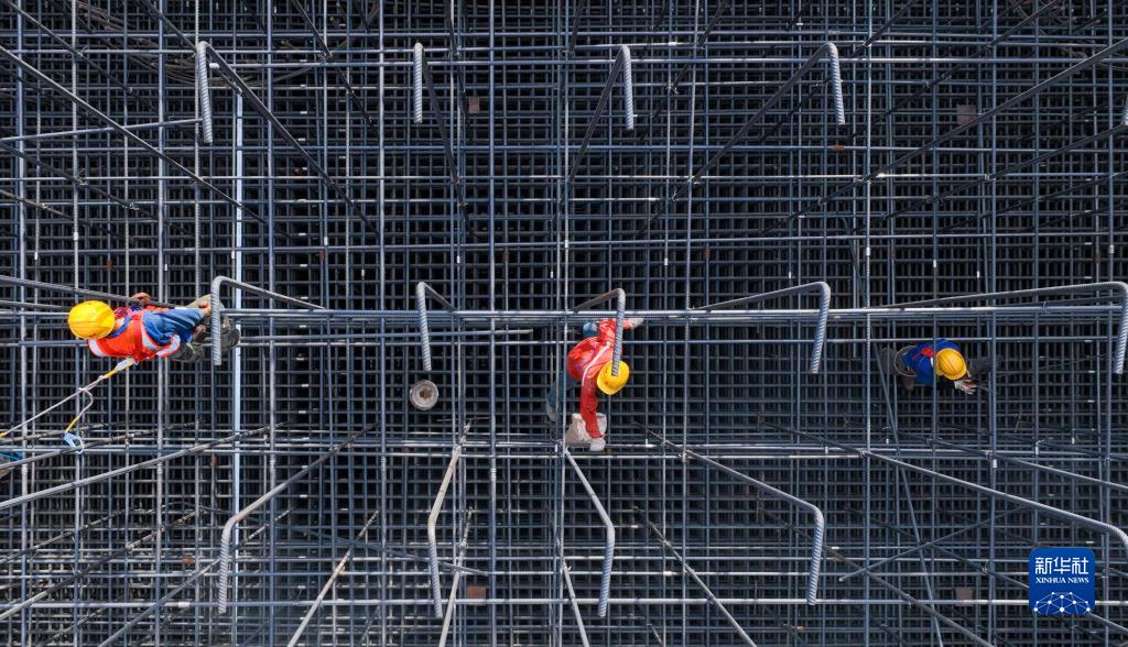 4月29日,工人在四川省遂寧市涪江六橋建設現場(chǎng)施工(無(wú)人機照片)。