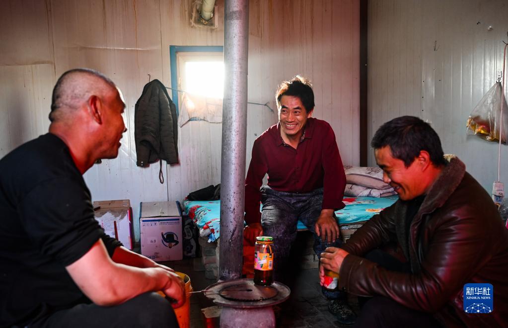 干完活回到臨時(shí)板房后,治沙客劉金成(中)與工友聊天(4月25日攝)。