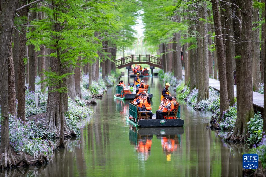 4月29日,游客在江蘇興化水上森林游玩。