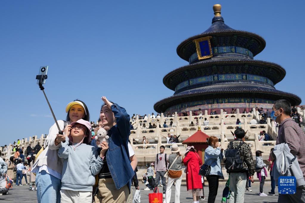 4月29日,游客在北京天壇公園合影留念。