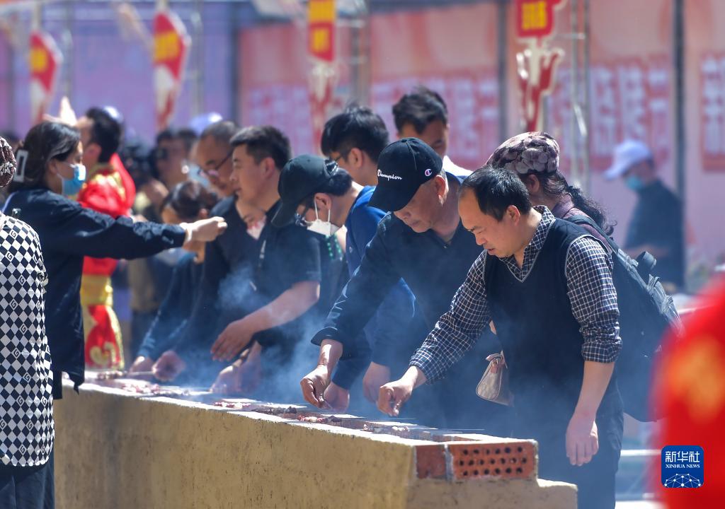 4月29日,在新疆國際大巴扎燒烤體驗區,游客在體驗自助燒烤。