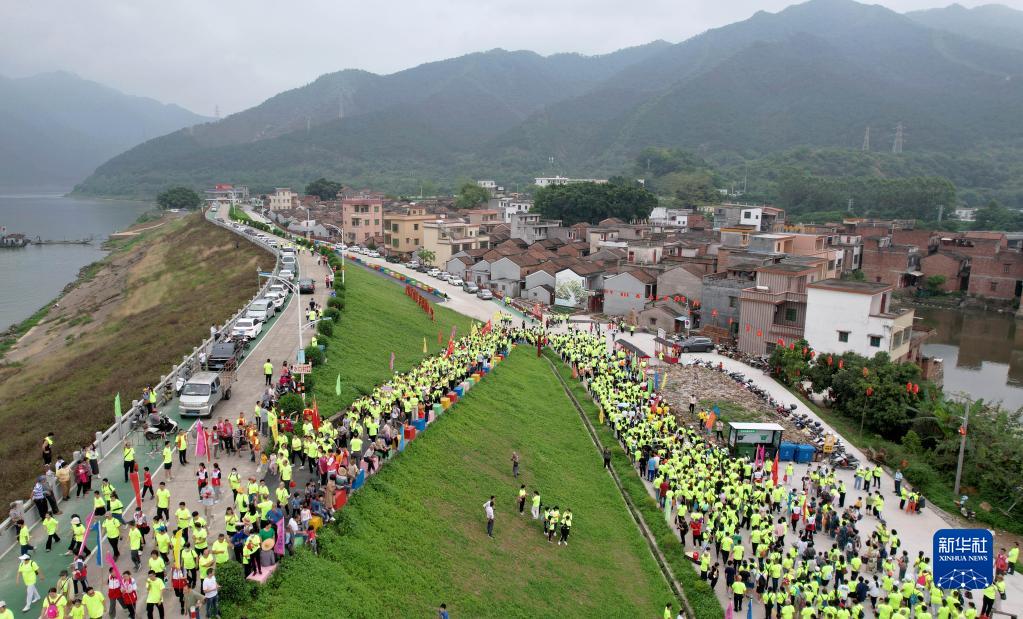 4月29日,游客參加廣東省肇慶市高要區金渡鎮水口社區舉行的徒步活動(dòng)(無(wú)人機照片)。