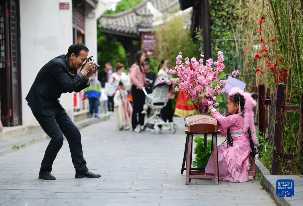 4月29日,在安徽省合肥市肥西縣三河古鎮景區,一名小朋友身著(zhù)古裝拍照。