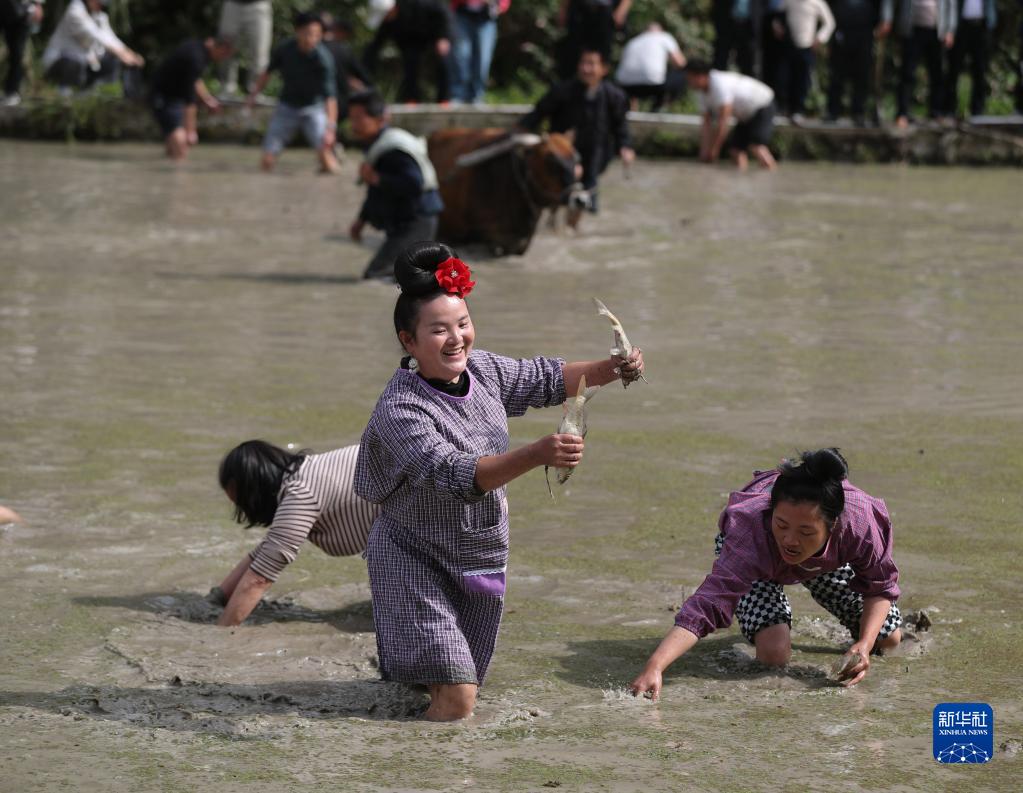 4月29日,在貴州省榕江縣兩汪鄉空申村,村民在趣味農耕活動(dòng)中捉魚(yú)。