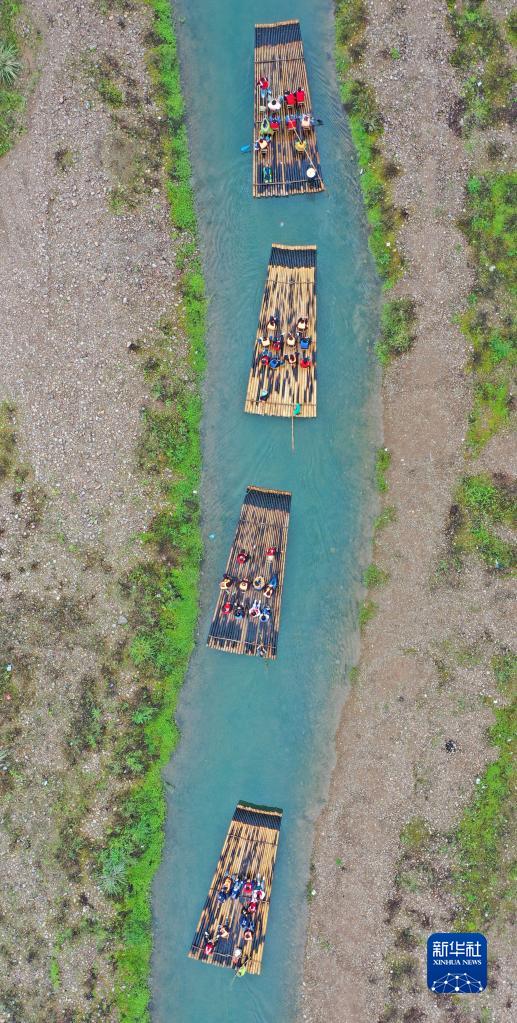 4月29日,游客在浙江省臺州市仙居縣永安溪體驗生態(tài)竹筏漂流(無(wú)人機照片)。