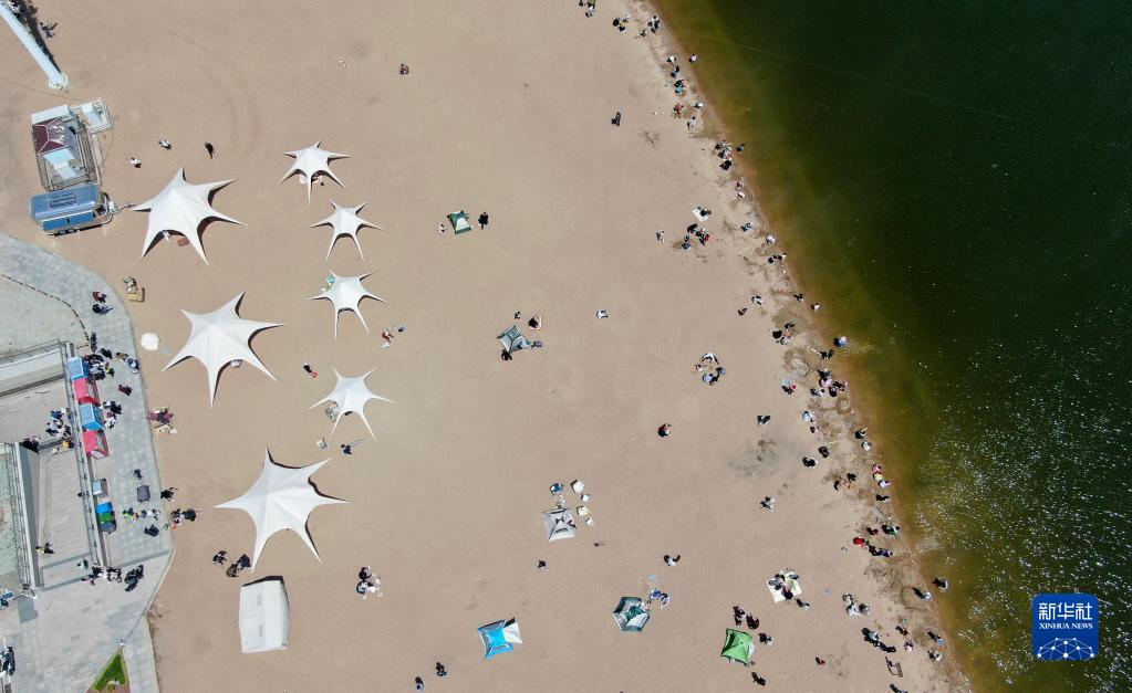 4月29日,市民在山東省臨沂市濱河景區陽(yáng)光沙灘游玩(無(wú)人機照片)。