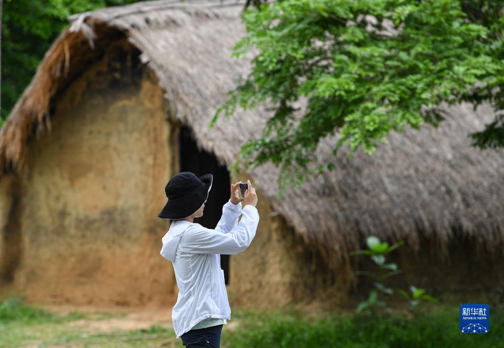 4月28日,游客在海南省東方市白查村參觀(guān)、拍攝黎族船型屋。