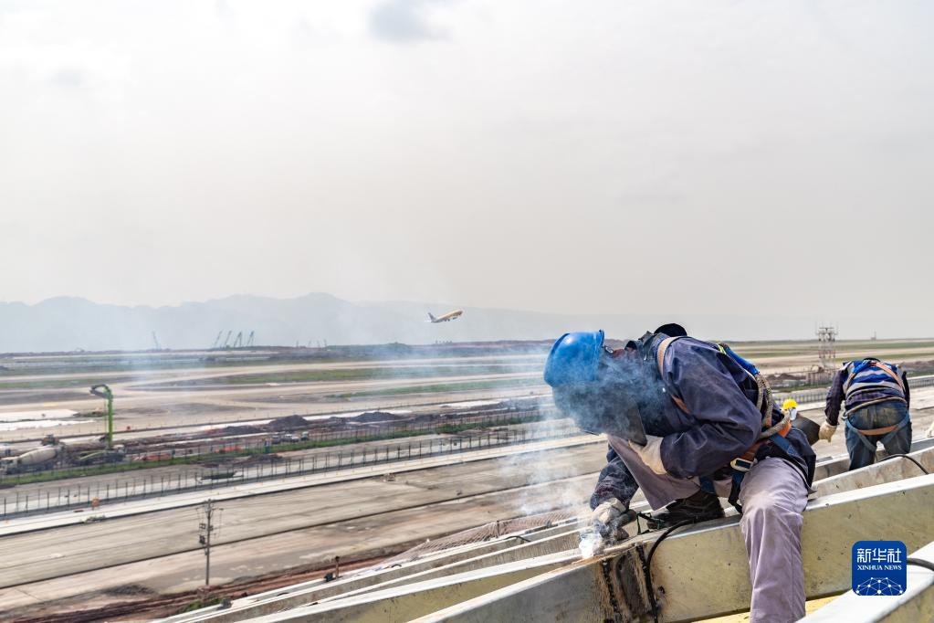 4月29日,工作人員在重慶江北國際機場(chǎng)T3B航站樓施工現場(chǎng)進(jìn)行焊接作業(yè)。