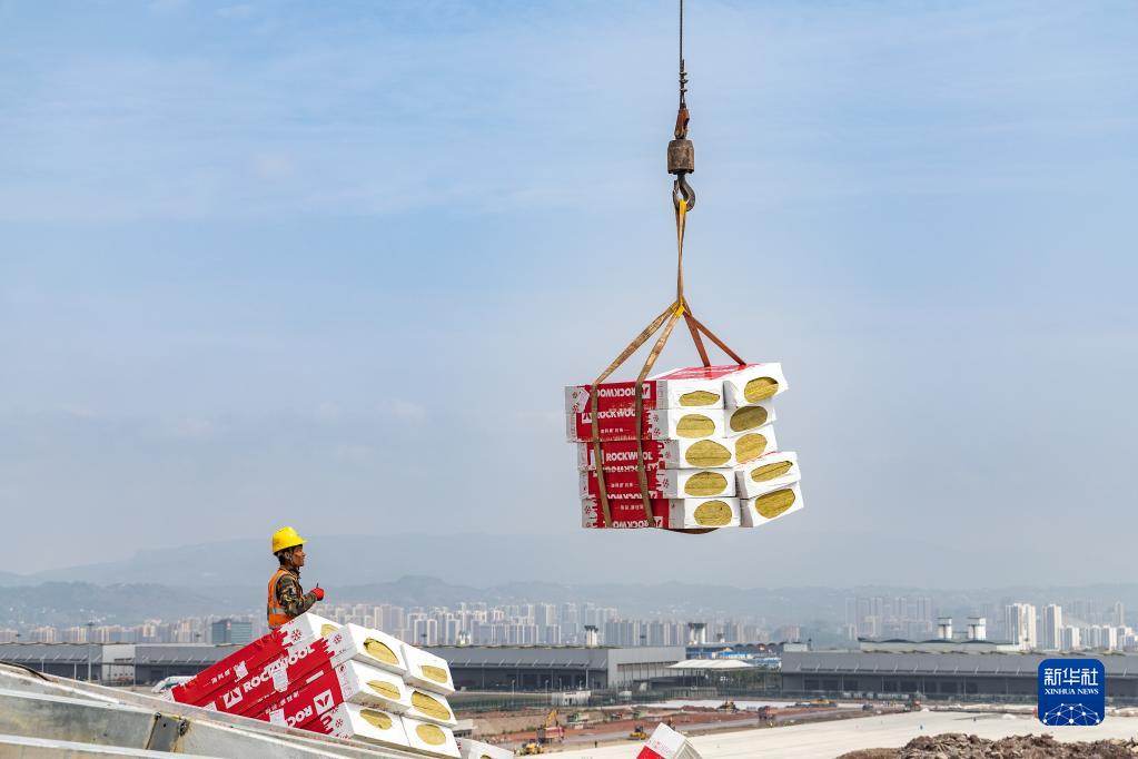 4月29日,工作人員在重慶江北國際機場(chǎng)T3B航站樓施工現場(chǎng)進(jìn)行屋面施工。