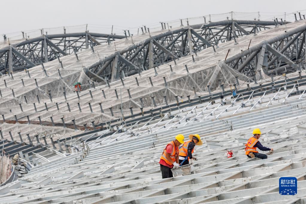 4月29日,工作人員在重慶江北國際機場(chǎng)T3B航站樓施工現場(chǎng)進(jìn)行屋面施工。