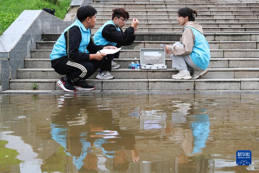 4月29日,在衡陽(yáng)縣西渡鎮新橋村,南華大學(xué)的大學(xué)生志愿者在檢測水質(zhì)。