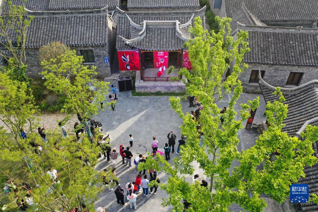4月29日,市民和游客在盱眙縣第一山歷史文化街區觀(guān)看黃梅戲(無(wú)人機照片)。