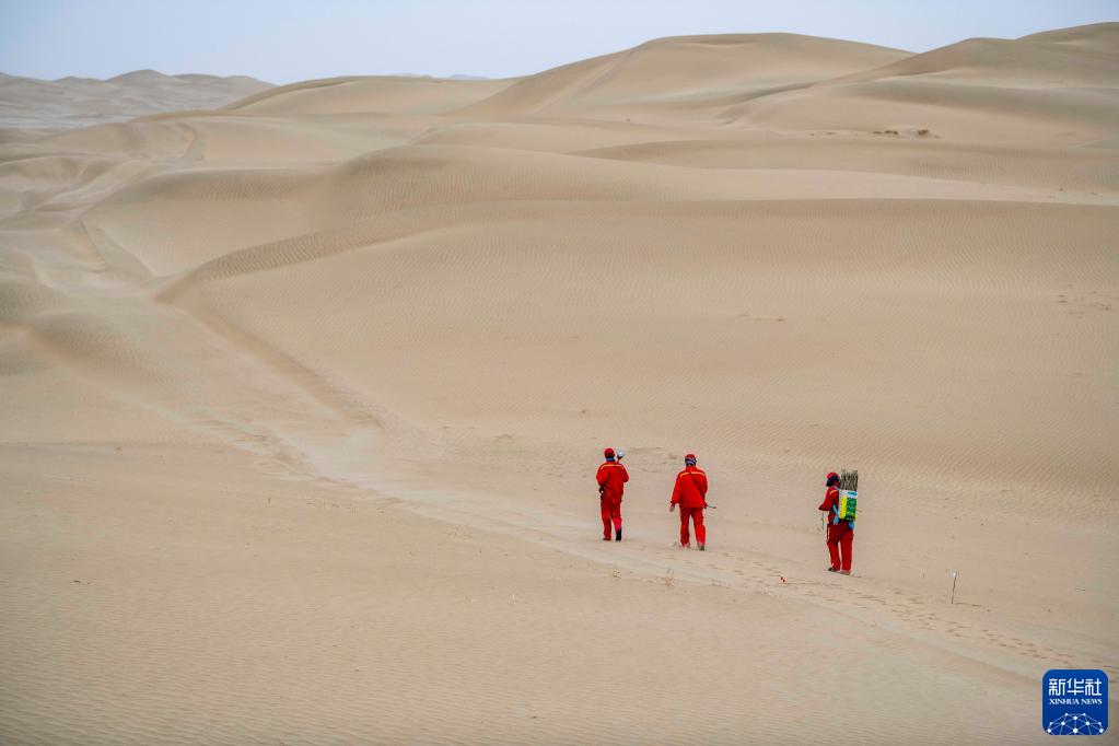東方地球物理公司新疆塔里木物探處的工人馮永生(前)、馮雙生(中)、馮志鵬在沙漠中進(jìn)行測量定位,標記鉆井點(diǎn)(2021年2月25日攝)。