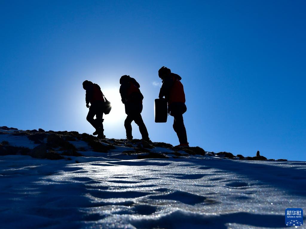 國家電網(wǎng)西寧供電公司輸電運檢中心運檢人員在登山巡檢(2021年1月21日攝)。