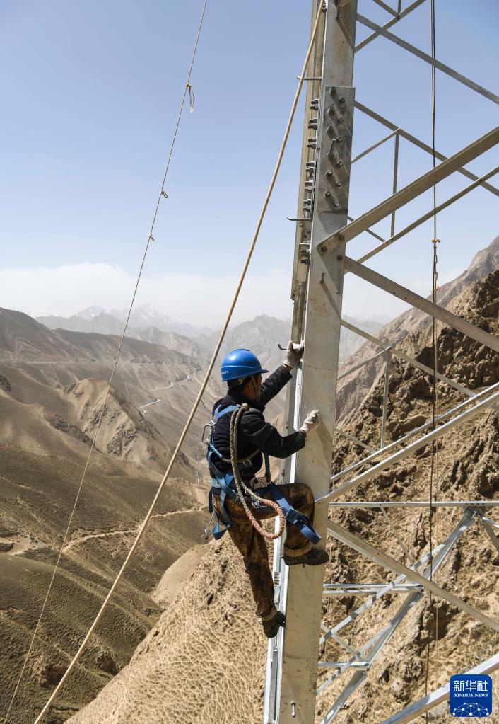 參與新疆葉城縣西合休鄉通電工程的工人在昆侖山中攀爬鐵塔(2020年4月29日攝)。