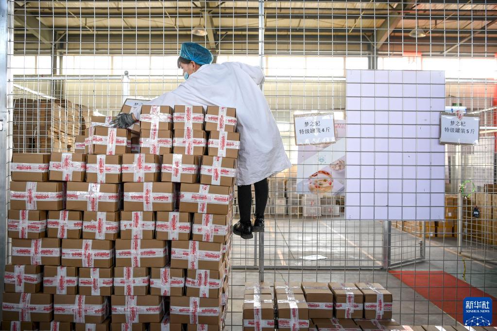 在寧夏銀川市永寧縣閩寧鎮閩寧禾美電商扶貧車(chē)間,工作人員在倉庫整理貨物(2020年11月10日攝)。