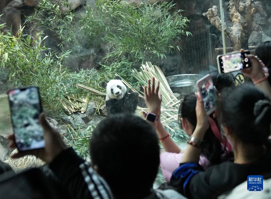 4月30日,游客在北京動(dòng)物園大熊貓館觀(guān)賞大熊貓。