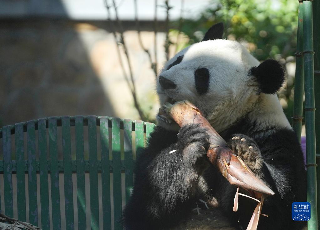 4月30日,在北京動(dòng)物園大熊貓館,大熊貓“萌蘭”在吃竹筍。