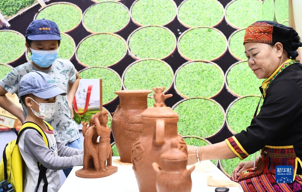 4月30日,小朋友在參觀(guān)2023海南錦繡世界文化周非物質(zhì)文化遺產(chǎn)傳統織繡印染技藝項目精品展展出的黎族原始制陶技藝。