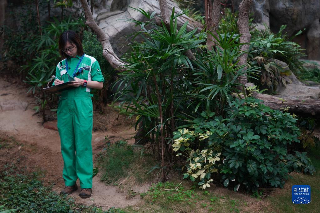 在香港海洋公園,大熊貓“奶媽”胡綺琪在開(kāi)園前做準備工作(4月19日攝)。