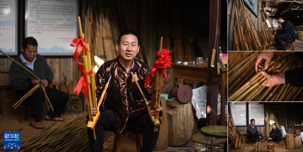 拼版照片:左圖為廣西融水苗族自治縣苗族蘆笙制作非遺傳承人——51歲的梁瑞輝(2023年4月26日攝);右上、中、下圖為梁瑞輝在制作、調試蘆笙(2023年4月26日攝)。