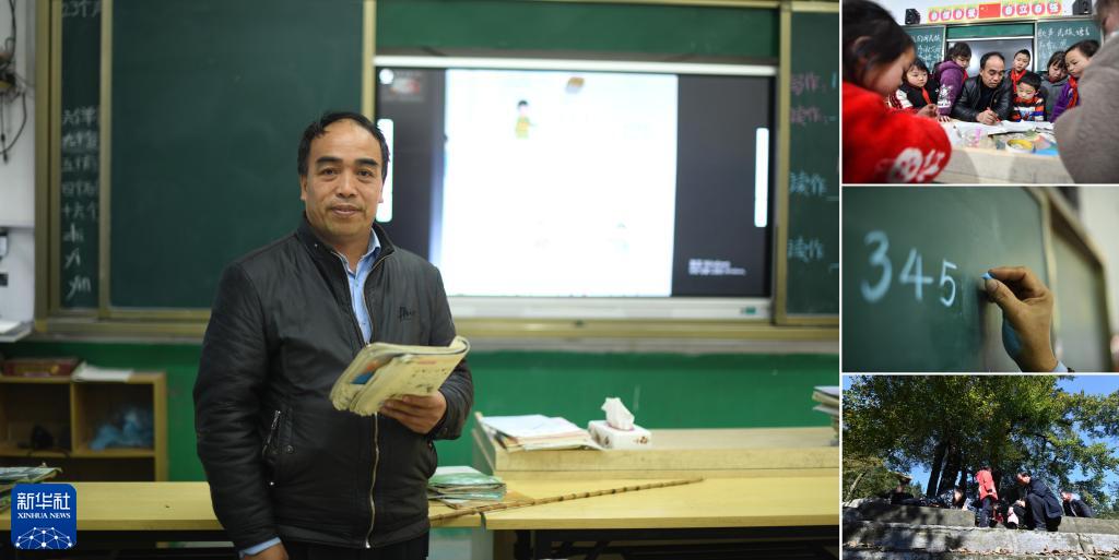 拼版照片:左圖為廣西融水苗族自治縣桿洞鄉烏英教學(xué)點(diǎn)53歲的老師潘先鋒(2023年4月25日攝);右上圖為潘先鋒給孩子們輔導功課(2022年1月12日攝);右中圖為潘先鋒在黑板上寫(xiě)字(2023年4月25日攝);右下圖為潘先鋒在給學(xué)生輔導功課(2021年11月25日攝)。