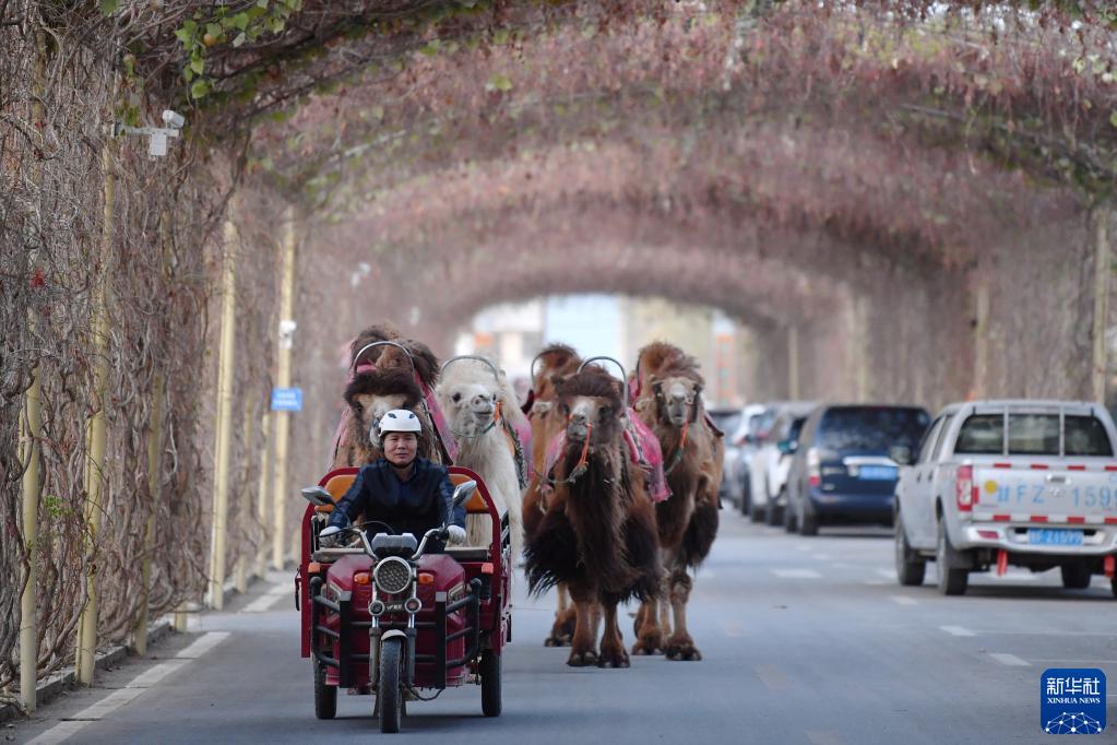 曹文華騎著(zhù)三輪車(chē)帶著(zhù)駱駝“下班”(4月24日攝)。