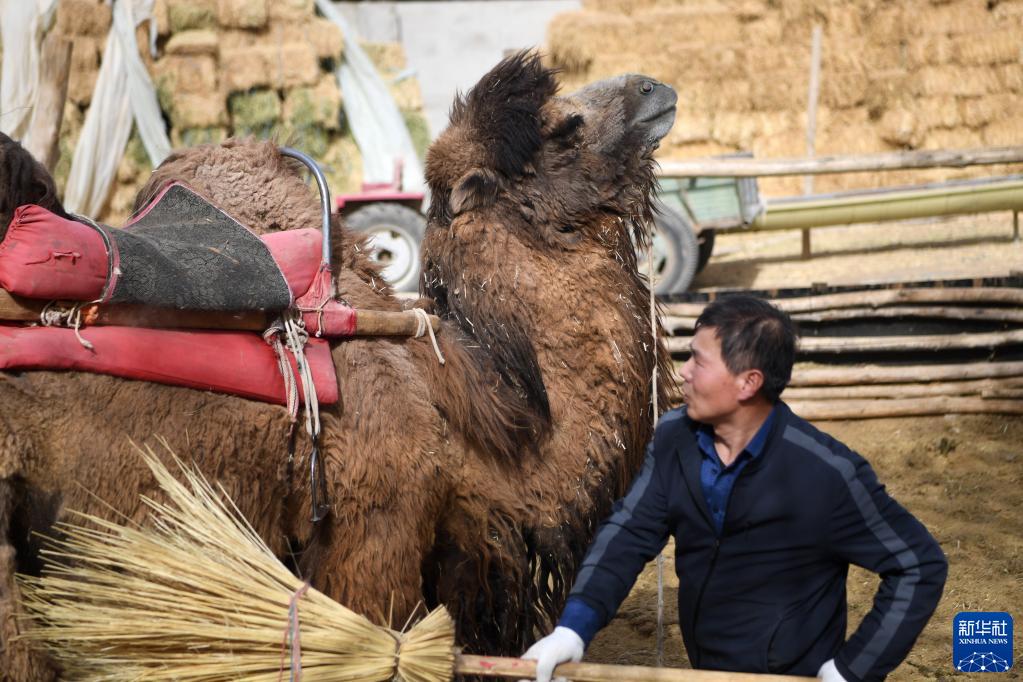 曹文華在駝圈里打掃衛生,為駱駝“上班”做準備(4月24日攝)。