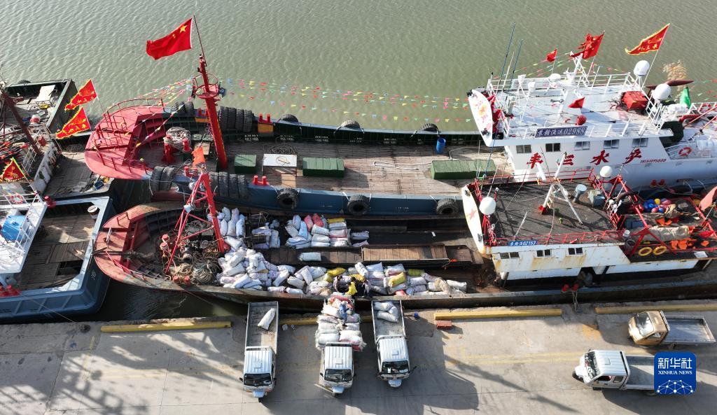 4月30日,在江蘇省連云港市贛榆區青口漁港碼頭,漁民在卸載漁具,為即將到來(lái)的伏季休漁做準備(無(wú)人機照片)。