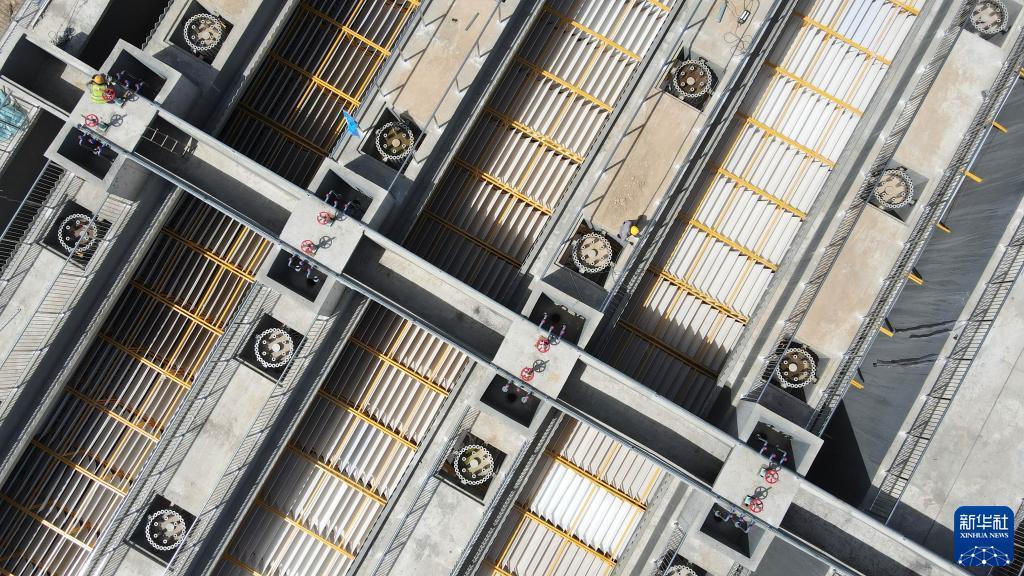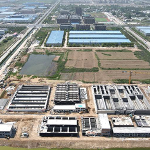 工人在懷遠經(jīng)濟開(kāi)發(fā)區第二污水處理廠(chǎng)項目現場(chǎng)進(jìn)行收尾施工(4月30日攝,無(wú)人機照片)。