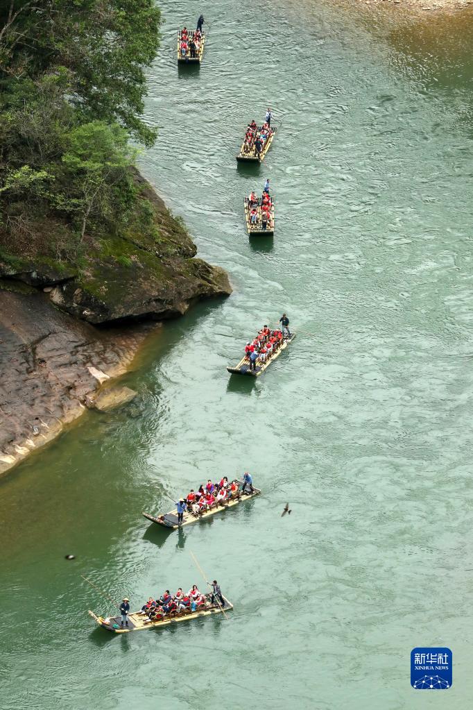 4月30日,游人在福建武夷山國家公園九曲溪乘坐竹筏欣賞兩岸風(fēng)光。