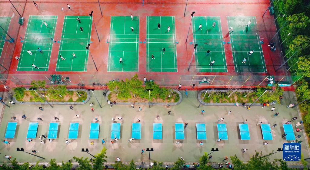 4月30日晚,市民在重慶市梁平區全民健身中心運動(dòng)(無(wú)人機照片)。
