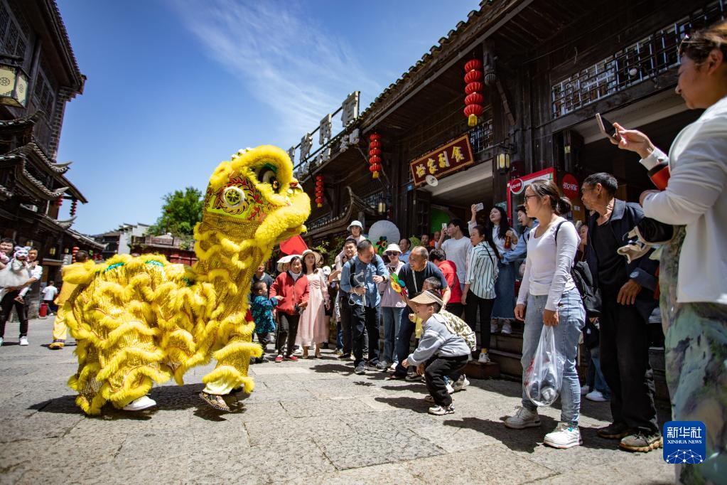 4月30日,游客在重慶市秀山土家族苗族自治縣洪安古鎮老街觀(guān)看舞獅表演。