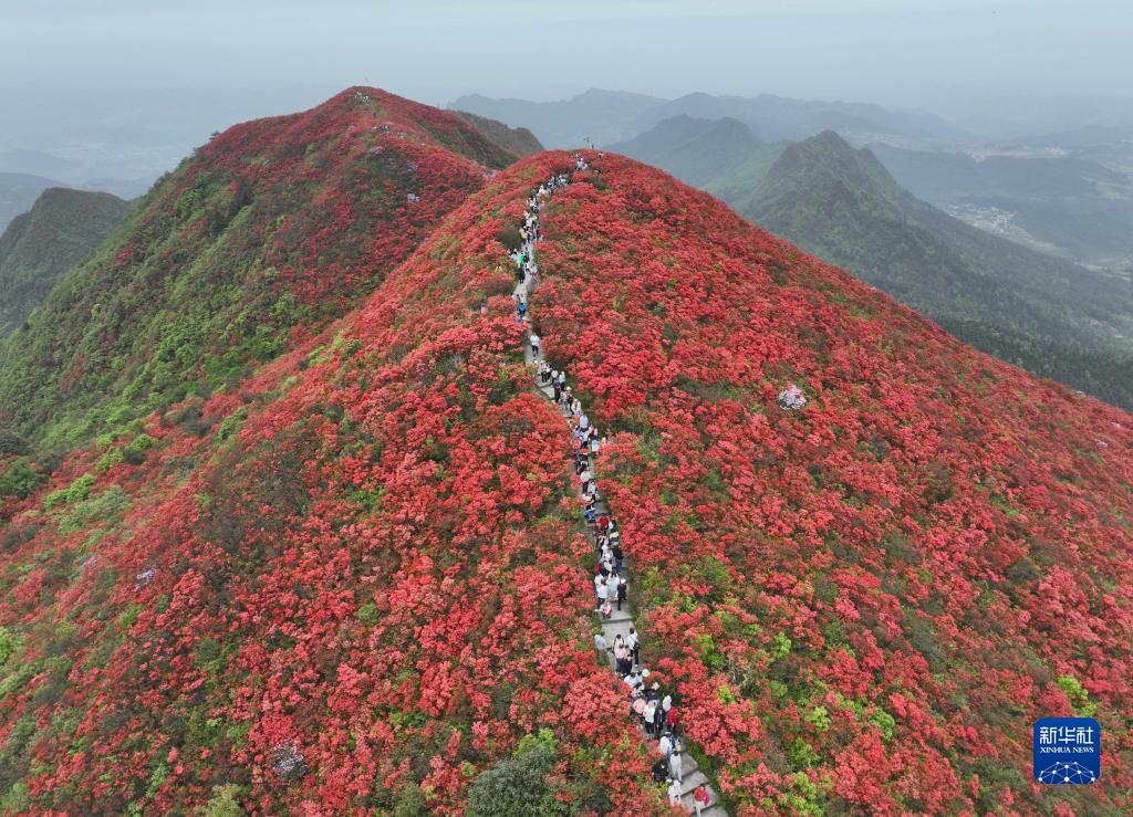 4月30日,游客在貴州省黔東南苗族侗族自治州丹寨縣龍泉山景區登山賞花游玩(無(wú)人機照片)。