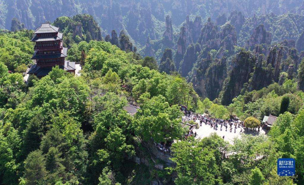 4月30日,游人在湖南張家界國家森林公園天子山游玩賞景(無(wú)人機照片)。